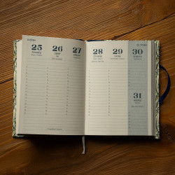 Ručně vázaný diář velikosti 11 x 15,5cm s naším originálním zpracováním. Desky potažené designovým papírem s praktickou gumičkou.