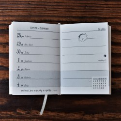 Ručně vázaný diář velikosti 11 x 15,5cm s naším originálním zpracováním a citáty uvnitř. Desky potažené designovým papírem s praktickou gumičkou.